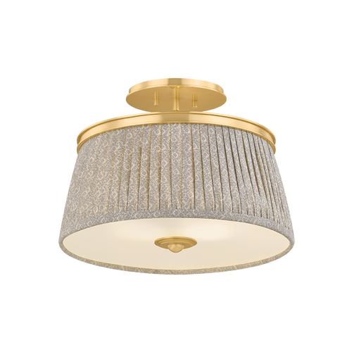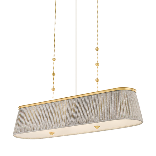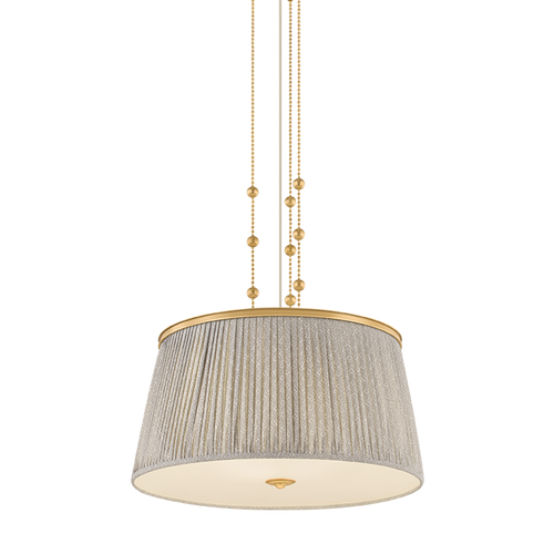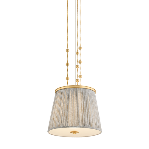 Recalling the design aesthetics of Adolf Loos, the Valeria family updates modern silhouettes with a hint of countryside charm. Softly gathered linen shades are printed with a gray-and-white botanical pattern, infusing the design with warmth and whimsy. A clear etched glass diffuser at the base softens the light into an inviting glow. Finished in Aged Brass, the metalwork is accented by decorative bauble detailing. Valeria is available as a 1- or 3-light pendant, a 2-light semi flush mount, and a 3-light linear.