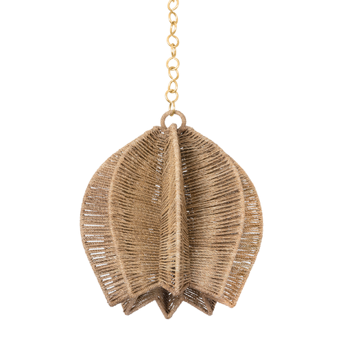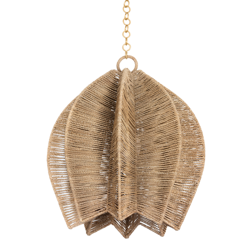 Crafted from Natural Abaca rope, this botanically-inspired pendant emanates charm with an intricate shape and weave pattern. Valatie is suspended by a Vintage Gold Leaf chain that melds with the natural hue of the Abaca while adding a luxurious touch. Available in two sizes, it creates a beautiful focal point above a dining table.