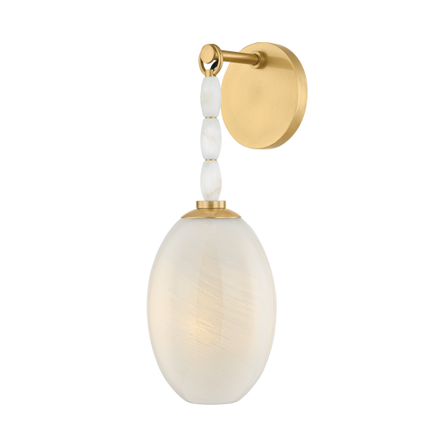 A piece of jewelry for the wall, Yolanda features a delicate glass shade dangling from a strand of alabaster beads. The cloud inside etched glass technique creates a soft, milky glow that fills each shade, echoing the natural striations of the alabaster. Luxurious yet playful, this sconce is finished in timeless Aged Brass.