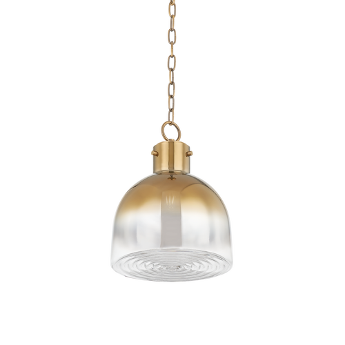 Beryl is a fresh take on industrial style—using material and texture to make it modern. Enclosed at the bottom in rippled glass, light is reflected from a lens in the neck for a beautiful, eye-catching effect. This dome-shaped glass pendant is finished in a brass-plated ombre, obscuring the light source and adding a warmth that complements the Patina Brass hardware. Available as both a large and small pendant, the smaller size can be mounted close to the ceiling.