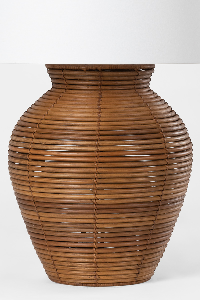 Newark is familiar in shape, large in scale and effortlessly usable. The natural rattan base pairs with a white Belgian linen shade to bring an overall softness and organic feel to the piece, adding a touch of coastal to any interior.