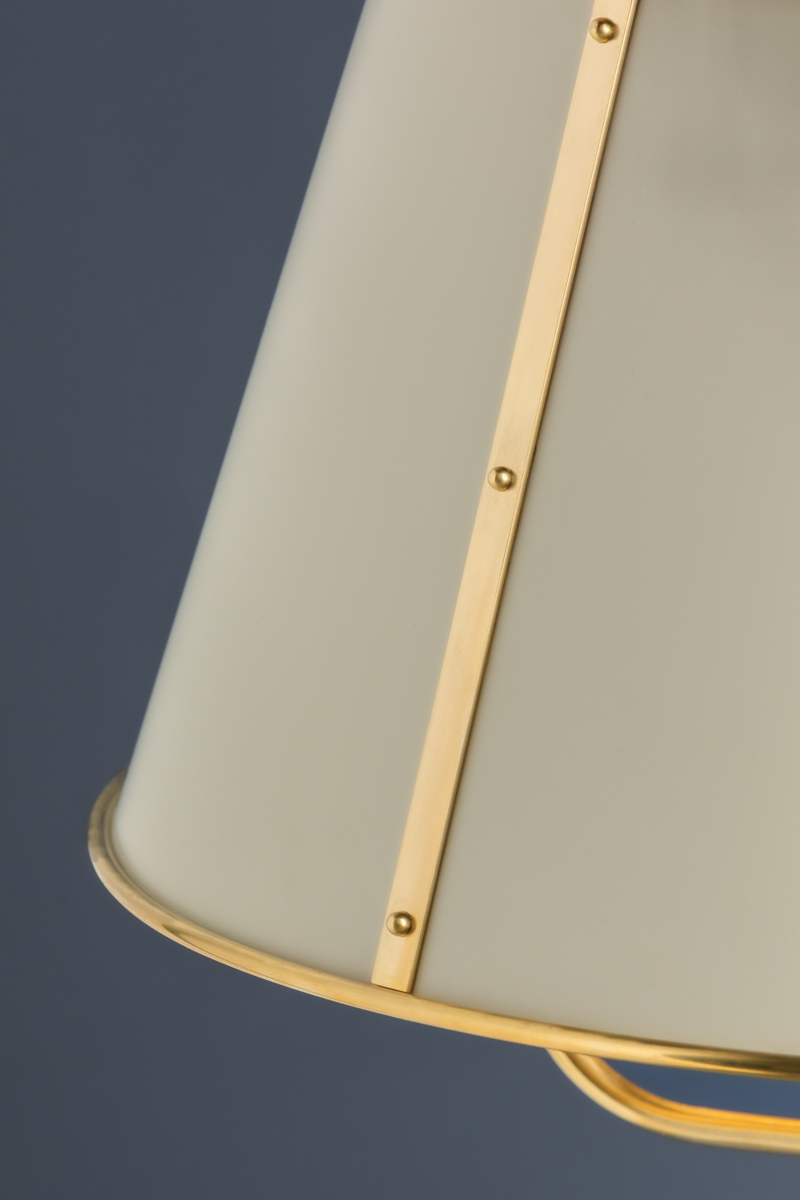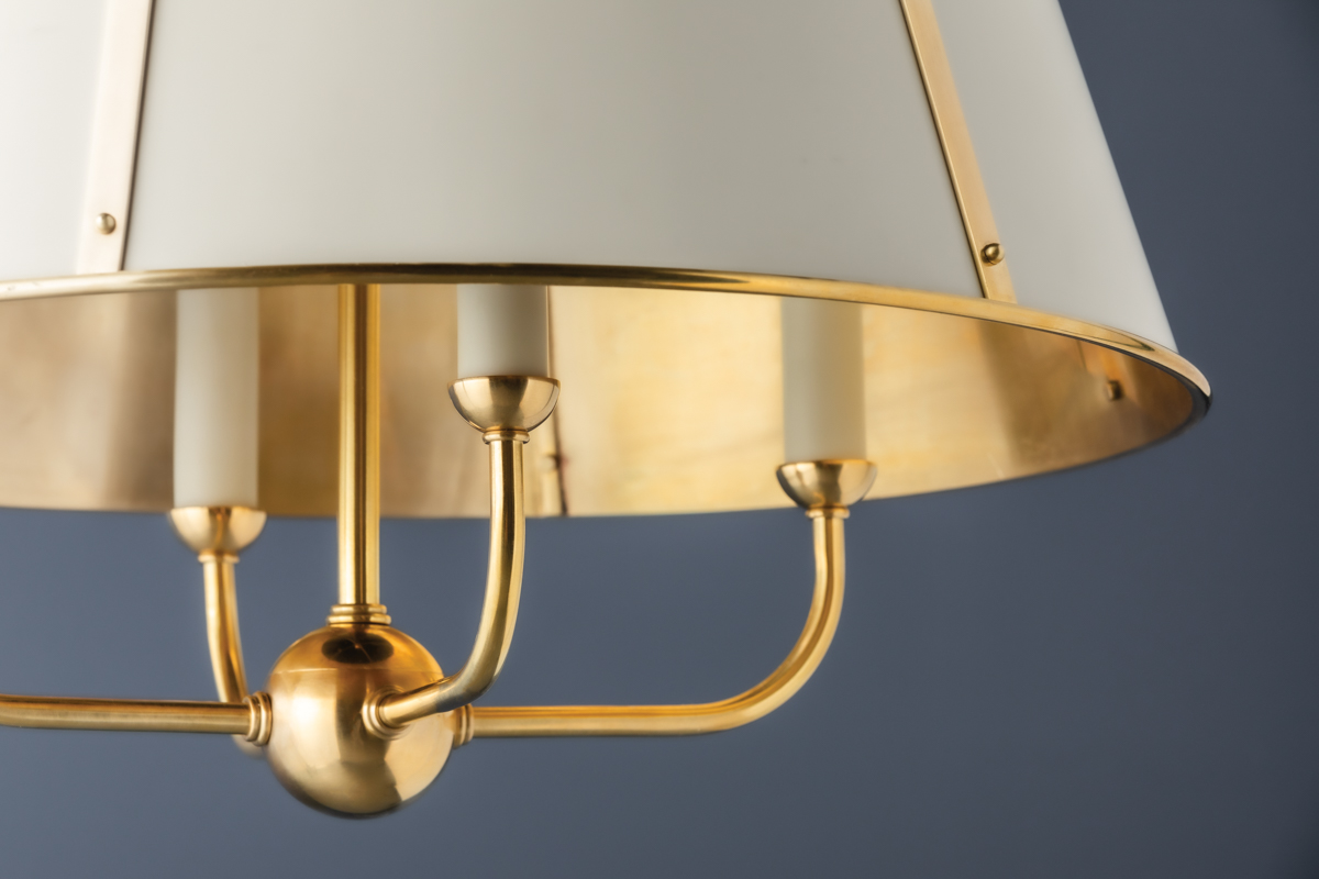 The Cambridge family features refined, metal drum shades with sleek details. The brass interior of the chandeliers amplifies light when illuminated, creating a warm, atmospheric glow. Strips of metal with visible screws add a modern touch, giving each fixture a distinctive industrial flair. Available in 4 and 6-light formats, Cambridge is well-suited to a dining room or kitchen. Available in three finish options, Aged Brass and Soft Studio Green, Aged Brass and Soft Crimson and Polished Nickel and Soft French Blue.