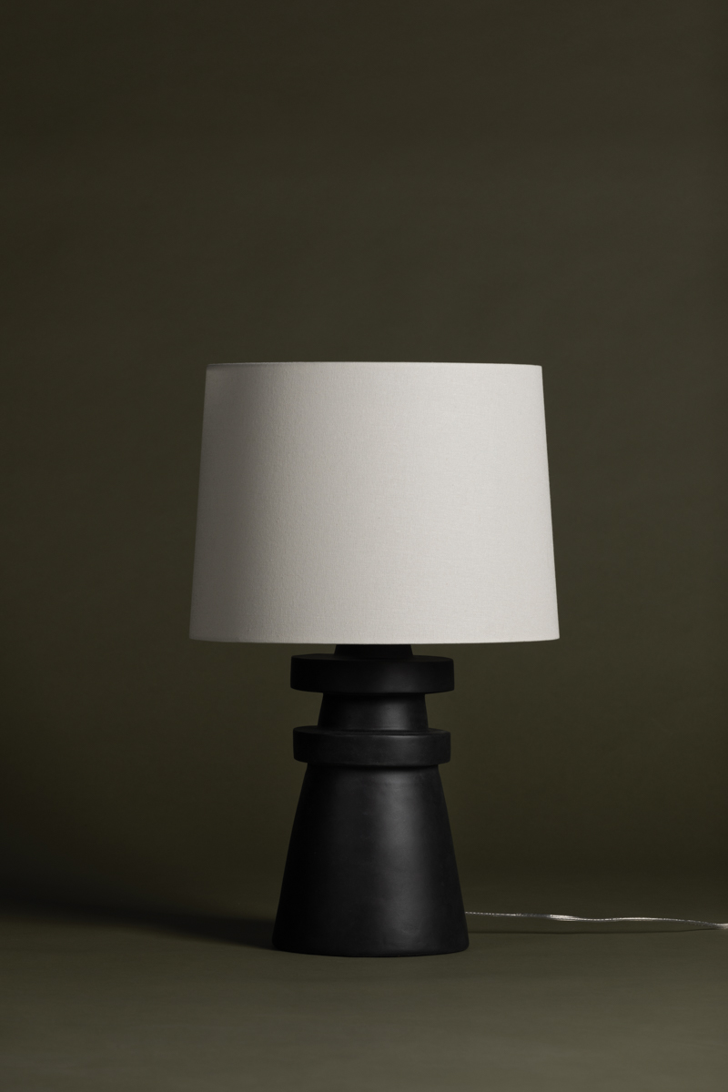 A conical base of charcoal ceramic gives Grover a hand-crafted feel that makes a strong sculptural statement. The ceramic rings add visual interest and balance and the off-white linen drum shade brings contrast and texture to this artistic, modern table lamp.